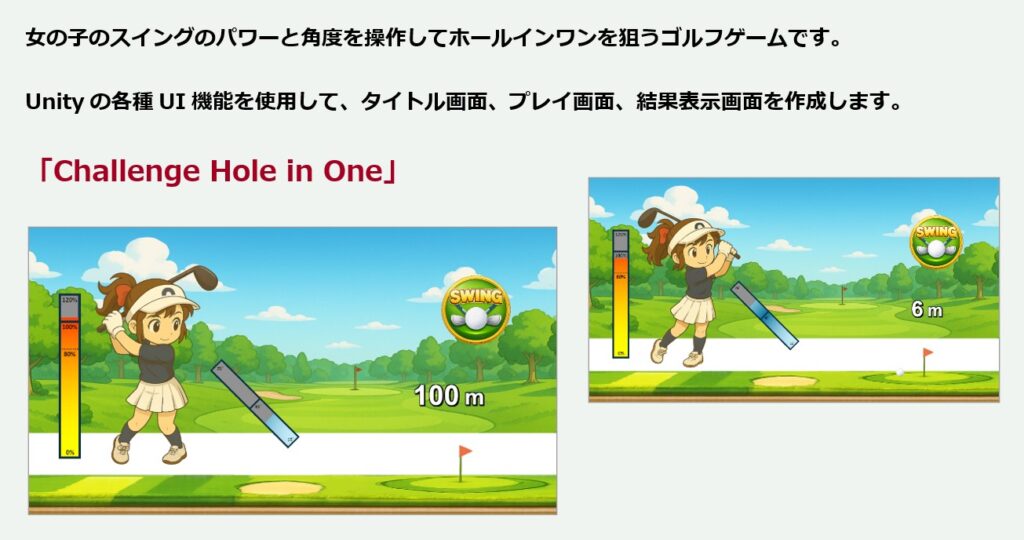 Unityの各種「UI」機能の解説と、それらの機能を網羅的に使用したゲームとしてゴルフゲームを作成します。