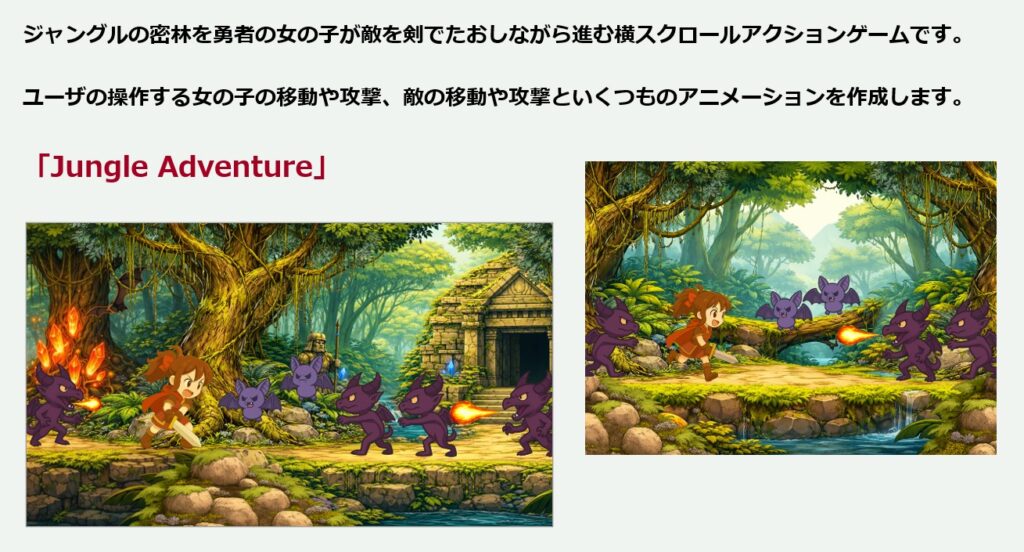 Unityの各種「アニメーション」機能の解説と、それらの機能を網羅的に使用したゲームとして横スクロールアクションゲームを作成します。