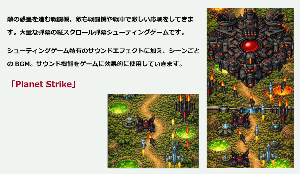 Unityの各種「サウンド」機能の解説と、それらの機能を網羅的に使用したゲームとして縦スクロールシューティングゲームを作成します。